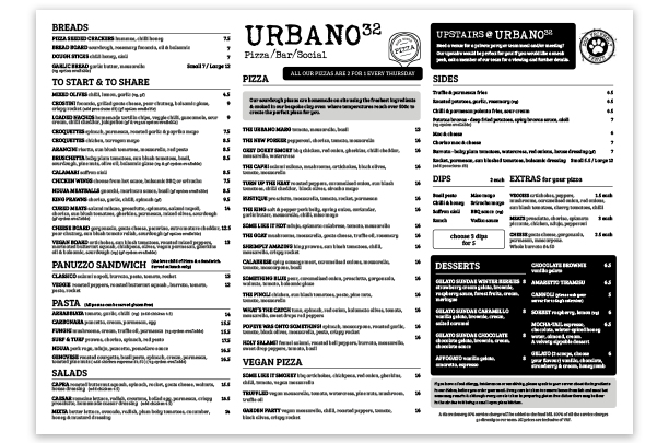 Urbano32 has a progressive approach towards sourdough pizza using exciting & unique toppings to bring something new to the pizza world. Our menu also offers a delicious range of small plates, pastas & salads. Our bar is fully stocked with a small but well defined range of beers, fine wines and expertly crafted cocktails